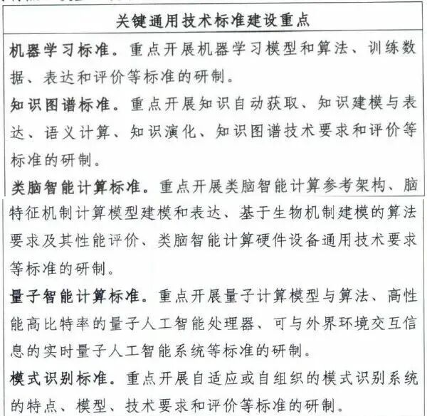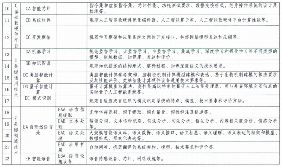 D关键通用技术标准主要围绕机器学习、知识图谱、类脑智能计算、量子智能计算、模式识别等方面,为人工智能应用提供通用技术支撑;