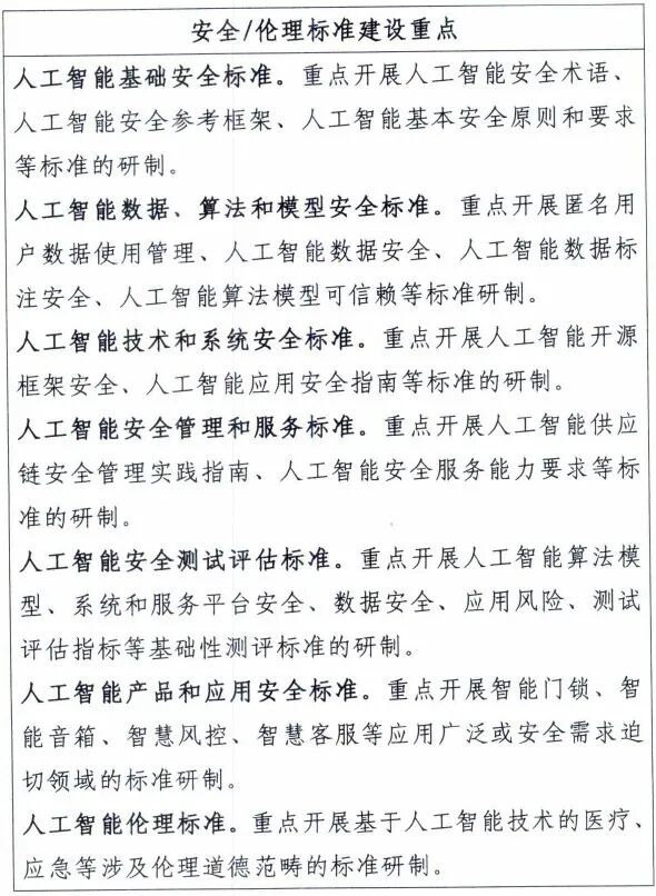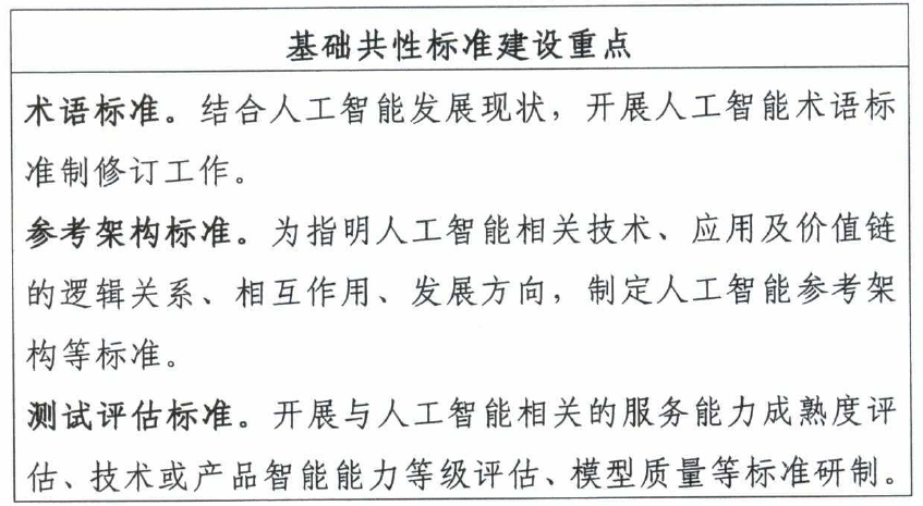 1.智能芯片标准。规范智能计算芯片、新型感知芯片及相关底层接口等,为人工智能模型的训练和推理提供算力支持。包括指令集和虚拟指令集、芯片性能、功耗测试要求、数据交换格式、芯片操作系统的设计及检测等标准。