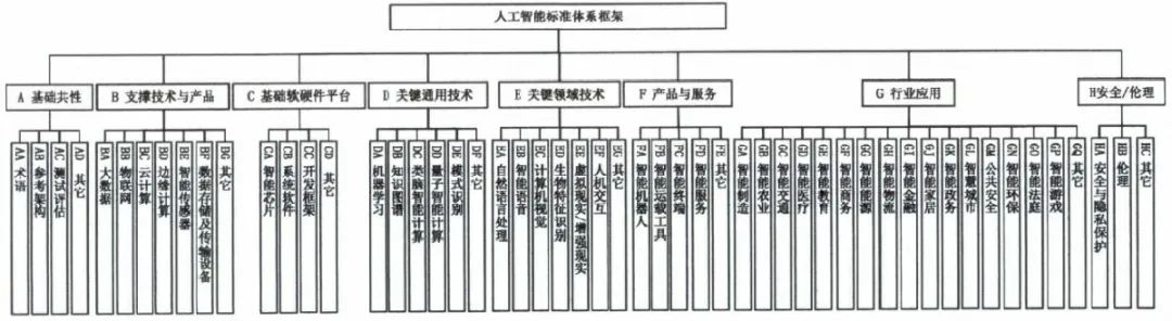 其中,A基础共性标准包括术语、参考架构、测试评估三大类,位于人工智能标准体系结构的最左侧,支撑标准体系结构中其它部分;