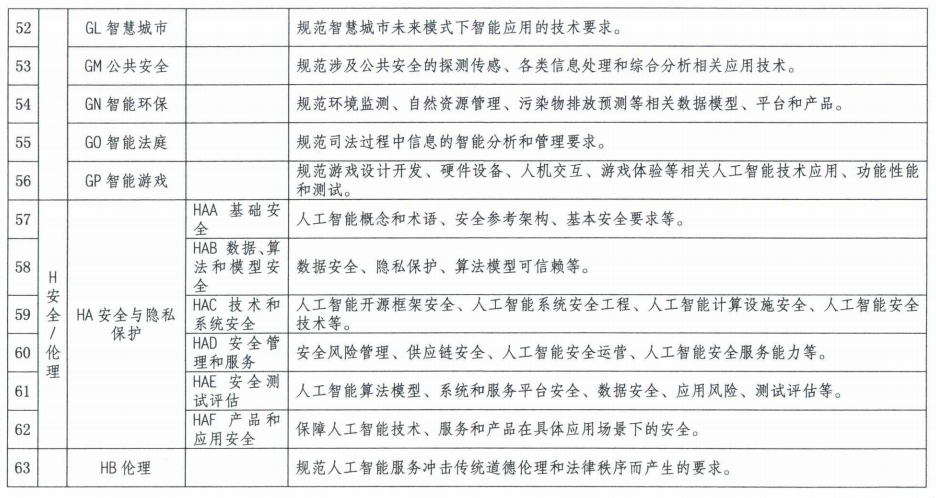 12.智慧城市领域。规范智慧城市未来模式下智能应用的技术要求,包括评估人工智能技术在复杂城市环境下的风险,评估城市安全、辅助决策等应用或产品的智能程度等。