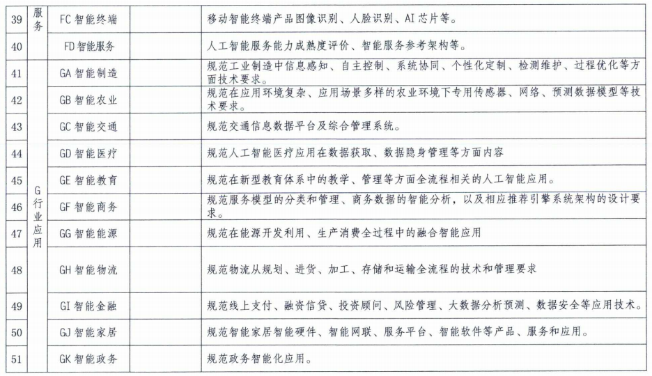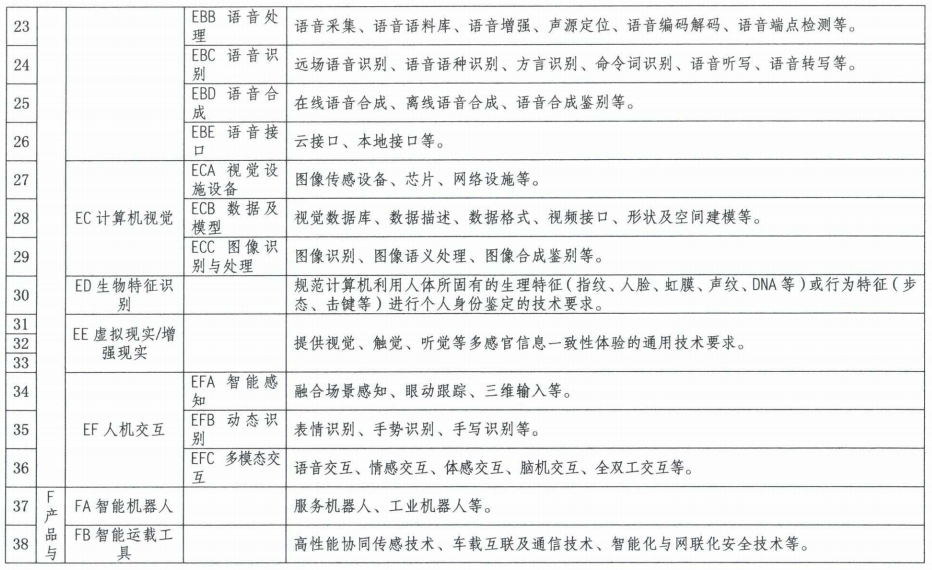 F产品与服务标准包括在人工智能技术领域中形成的智能化产品及新服务模式的相关标准;